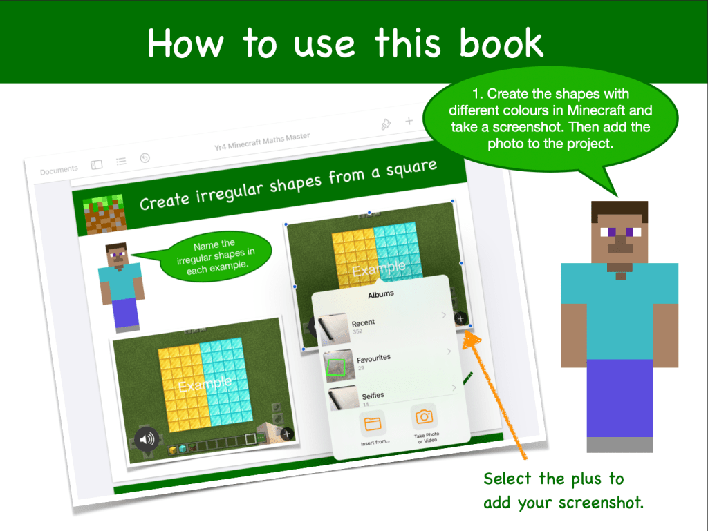 The Minecraft Maths templates asks students to complete a series of challenges then screenshot the task and place in a Book Creator template. Topics cover Maths concepts like numerals, partitioning, number lines, ten frames, place value charts and 2D shapes.